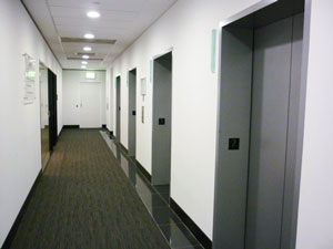 入り口を入ると向かって右側にカフェがあります  入り口を進むとエレベーターがあります